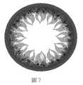 圖8展示了根據本發明的含有四個印花圖案(圖2、圖3、圖4和圖5)的接觸鏡片的第三實例。圖8的設計係最頂的圖案係專門意在增大虹膜直徑的外觀的、深色輪廓分明的外環的四個印花圖案。第四層係由相似的鬱金香花形狀組成的第二鬱金香花環形圖案,該等鬱金香花形狀以與第一鬱金香花環形圖案不同的方式圍繞圓環重複。Figure 8 shows a third example of a contact lens containing four print patterns (Figure 2, Figure 3, Figure 4, and Figure 5) according to the present invention. The top pattern of the design in Fig. 8 is the four printing patterns with a dark and well-defined outer ring specifically intended to increase the appearance of the diameter of the iris. The fourth layer is a second tulip flower ring pattern composed of similar tulip flower shapes, and the tulip flower shapes repeat around the ring in a different way from the first tulip flower ring pattern.