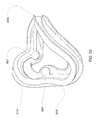 Similarly, with respect to at least the example clip shown inFIGS. 14, 18 and 19, two active portions of the clip's structure are theperipheral lip3540 that form an effective cantilever over-hang portion and a middletransverse portion3541 of the clip's periphery between theframe coupling surface3539 and thecushion support surface3538. Both of these components can act as springs and provide a sealing reaction force through their deformation. Distribution of the clip-contributed sealing force around the mouth may be governed by the clip's material and geometry. Moreover, the force may be controlled by the user depending on the amount of tightening of the headgear of the mask.