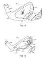 BACKGROUND OF THE INVENTIONIn conventional sets of “iron” golf clubs, each club includes a shaft with a club head attached to one end and a grip attached to the other end. The club head includes a face for striking a golf ball. The angle between the face and a vertical plane is called “loft.” In general, the greater the loft is of the golf club in a set, the greater the launch angle and the less distance the golf ball is hit.