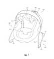 BACKGROUND OF THE INVENTIONChildren's bouncers are used to provide a seat for a child that entertains or soothes the child by oscillating upward and downward in a way that mimics a parent or caretaker holding the infant in their arms and bouncing the infant gently. A typical children's bouncer includes a seat portion that is suspended above a support surface (e.g., a floor) by a support frame. The support frame typically includes a base portion configured to rest on the support surface and semi-rigid support arms that extend above the base frame to support the seat portion above the support surface. In these embodiments, an excitation force applied to the seat portion of the children's bouncer frame will cause the bouncer to vertically oscillate at the natural frequency of the bouncer. For example, a parent may provide an excitation force by pushing down on the seat portion of the bouncer, deflecting the support frame, and releasing the seat portion. In this example, the seat portion will bounce at its natural frequency with steadily decreasing amplitude until the bouncer comes to rest. Similarly, the child may provide an excitation force by moving while in the seat portion of the bouncer (e.g., by kicking its feet).