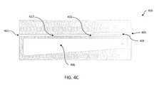 FIG. 4A illustrates another embodiment of a partially-encapsulatedsensing chip400 that can have an additional metering andmixing compartment409. In some variations, the metering and mixing compartment(s)409,412 are separate, while in some variations the metering and mixing compartments are integrated into a single compartment. As illustrated, the metering/mixing compartment(s) could include one or more reagents, such as lyophilized reagents, as described in more detail below. The reagents may be held within the compartment until fluid (e.g., sample fluid) is added. For example, fluid pressure may be applied to push or pull fluid (including sample fluid) into the compartment and allow mixing with the loaded reagents. Suction (negative pressure) may be applied at a port (not shown) such as an exit port, and/or the entrance port to pull fluid into or out of the chamber; similarly positive pressure may be applied to push fluid into and out of the chamber. The housing may include ports (e.g., venting ports) that include a membrane allowing air to flow in/out but preventing liquid (e.g., sample) from flowing out.