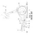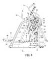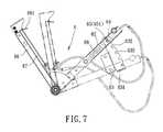 Referring toFIGS. 3 and 5, each linkingunit5 includes ahandle rod51 which is pivotably connected to thefront rod section321 and which extends upwardly and downwardly to have an upper handgrip end and a lower end, anadjusting rod52 which has one end pivotably connected to thehandle rod51, apedal rod53 which has afront portion531 pivotably connected to the lower end of thehandle rod51 and which extends rearwardly from thefront portion531 to have amiddle portion533 and arear portion532, aswing rod54 which is pivotably connected to therear rod section322, a first linkingrod55 which is pivotably connected to the adjustingrod52 and therespective crank41, a second linkingrod56 which has an end pivotably connected to therespective crank41 about an axis coaxial with that of the first linkingrod55 and an opposite end pivotably connected to theswing rod54, a third linkingrod57 which is pivotably connected to theswing rod54 and themiddle portion533 of thepedal rod53 and which cooperates with thehandle rod51 to suspend thepedal rod53, and afoot pedal58 which is disposed on therear portion532 of thepedal rod53.