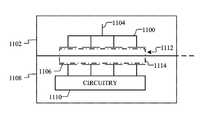 FIG. 11 depicts cross-wafer capacitors where theconductive segments1100 in thefirst wafer1102 are connected to acommon node1104. Theconductive segments1106 in thesecond wafer1108 can be connected to one or more discrete circuits orsignal lines1110. Some or all of thecross-wafer capacitors1112 can be connected to the same circuit orsignal line1110, or eachcross-wafer capacitor1112 may be connected to a separate circuit orsignal line1110.