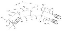 On a continuous basis, the successive positions of each of surrounding vehicles SV1 and SV2 with respect to the ego-vehicle are processed to generate representations of the paths AA and BB of the surrounding vehicles. Successive sensor measurement locations relating to each of vehicles SV1 and SV2 are connected with straight line segments as previously described to generate vehicle path approximations.