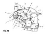 FIG. 13 shows the next step as the drive motor (not shown) begins to turn the drive gear (8) which turns the partial gear (17). This causes the injection arm (9) to pivot forward bringing the injection needle (24) toward the top of the hot capsule (27).