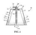 FIG. 2 is a diagram illustrating thecentrifuge bowl30, according to some embodiments described in the disclosure. Thecentrifuge bowl30 includes aninner bell102 and anouter bell104 that are rigidly coupled together and made to rotate in thecentrifuge22. Blood entering thecentrifuge bowl30 followspath106 through an inlet tube orchamber108 and into aseparation chamber110 situated between theinner bell102 and theouter bell104. The rotation of thecentrifuge bowl30 creates a centrifugal force that causes the blood within theseparation chamber110 to separate into different fractions based on the density of the blood components. The centrifugal force causesred blood cells112, which are higher density components of blood, to be propelled outward, against thecircumferential wall114 of thecentrifuge bowl30. Intermediate density blood components, such as white blood cells and platelets, are arranged in the thin layer known as thebuffy coat116, directly adjacent the concentrated mass ofred blood cells112. Lower density components, such as plasma that contains undesirable elements such as fat, are arranged in a layer (not shown inFIG. 2) that lies nearer the axis of rotation than thebuffy coat116.