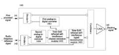 - the near-field reflected self-interference channel estimation module (1402), configured to receive the first digital signal transmitted by the first analog-to-digital converter (1401), obtain the digital baseband reference signal corresponding to the radio frequency reference signal, perform near-field reflected self-interference channel estimation according to the first digital signal and the digital baseband reference signal to obtain the near-field reflected self-interference component parameter, and transmit the near-field reflected self-interference component parameter to a near-field reflected self-interference signal reconstruction module (1403); and