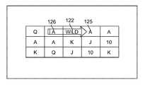 Turning now to the embodiment ofFIG. 6A, an array ofsymbols120 is shown in which aWILD symbol122 is positioned immediately to the left of a morphingsymbol124. In this embodiment, rather than change the morphingsymbol124 into another WILD symbol, the morphingsymbol124 changes into a second symbol immediately to the left of theWILD symbol122, or two symbol positions to the left of the morphingsymbol124. Thus, the morphingsymbol124 morphs into an “A”symbol125, taking the form of an “A”symbol126 located two symbol positions to its left, as shown inFIG. 6B.