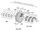 FIG. 47F depicts an embodiment for launching an electromagnetic wave that propagates along thetransmission medium4702. In one embodiment, a fundamental (TEM00 or Goubau)wave mode4722 can be launched along thetransmission medium4702. TheTEM00 wave mode4722 can be generated by a launcher (e.g., a transmitter) described in the subject disclosure such as, for example, the launcher ofFIG. 18R or 18T with more or the same number of MMIC's shown. To generate ahelical wave4724, a structure such as aspiral plate4723 can be placed coaxially along thetransmission medium4702. Thespiral plate4723 can be constructed of a dielectric material such as polyethylene or other suitable dielectric material as described in the subject disclosure. Thespiral plate4723 can have a structure similar to a spiral staircase that expands in thickness as one climbs the staircase. As a fundamental wave enters the dielectric material of thespiral plate4723, portions of the wavefront (shown symbolically as flat wavefronts inFIG. 47F) are delayed differently depending on the portion of thespiral plate4723 being penetrated. For example, at aninitial point4725 of thespiral plate4723, the thickness of thespiral plate4723 is d. This is the thinnest portion of thespiral plate4723. At amidpoint4725′, the thickness of the spiral plate is d′, which is a thicker portion than theinitial starting point4725 of thespiral plate4723. At theendpoint4725″, the thickness of the spiral plate is d″, which is the thickest portion of thespiral plate4723.