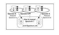 Today a specific spectrum block in a predefined area (e.g. region or country) is typically owned by a Mobile Network Operator. When operators share their spectrum blocks with other operators to form a joint cognitive radio network it is necessary to define a policy which exactly defines the rules how the spectrum is assigned to and released by each operator. The basic principle of such a policy is shown inFIG. 2. Operator A owns spectrum a and Operator B owns spectrum b. The spectrum is released when there is no need for it in the cell (left part ofFIG. 2) and the spectrum is expanded when it is needed, e.g. users enters the cell (right part ofFIG. 2). Even more complex policies follow this basic principle.
