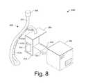 FIG. 8 is an isometric view of a package assembly including a rip-strip lowering mechanism and a container, in accordance with embodiments of the disclosure.