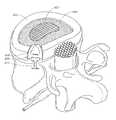 FIGS. 46A and 46B illustrate in perspective and side views respectively embodiments of asupport implant350 configured for closing, blocking, reinforcing, and/or repairing defects, openings, or weakened areas in a variety of patient tissues. In some embodiments, thesupport implant350 is particularly adapted for use in the intervertebral disc region, such as for reinforcing a weakened anulus and/or for closing defects. The support implant can inhibit herniation of disc material or augmentation implants outside the anulus or into defects in the anulus. Embodiments of thesupport implant350 provide these benefits while limiting interference with spinal joint movement including flexion, extension, and lateral bending movement.