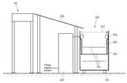 The system also comprises a number of transport carriages. Atransport carriage300 may for instance be a rolling container. Unlike a roller container, which is dimensioned on the basis of old British imperial units, a rolling container may have the dimensions of a pallet. For example, a base frame301 or transport frame of thetransport carriage300 delimits a substantially cuboidal space. The upper periphery of thetransport carriage300 is somewhat lower than the lower end of aslide200.