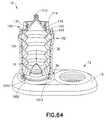 FIGS. 62-64 are sequential perspective and partial cross-sectional views showing operation of the bellows syringe on the pressure jacket for the embodiment shown inFIGS. 57-58.