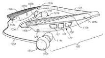 The right and left retractable ear plugs101aand101bare shown in an extended position inFIG. 1A, and in a retractedposition113 inFIGS. 1B, 1D, and 1E. Although one implementation of retractable/extendable ear plugs is shown, other configurations are possible. Moreover, the teachings herein are applicable to implementations in which ear pieces do not retract or extend.