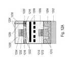 FIG. 12A-12B are exemplary drawing illustrations of the use and retention of thermally conductive hard mask layers for patterning contact layers of 3D stacked device layers;