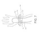 FIG. 7 is a schematic of aband708 wrapped around a wrist wherebyballoon701 compresses theradial artery705 andballoon703 compresses theulnar artery707. In the embodiment inFIG. 7, theballoon703 is located at or near the base of the palm (Guyon's canal)704 thereby compressing theulnar artery707 at a location where it is most accessible for compression and theballoon701 is located over the puncture site, which is generally about 2 cm. from the base of a palm. The pressure applied to the radial artery and the ulnar artery could be simultaneously and independently manipulated to optimize the pressure at which the bleeding from the radial artery stops while at the same time a high enough pressure is applied to the ulnar artery to prevent or minimize occlusion of the radial artery. In one embodiment, mark or marks (not shown) may be placed on theradial balloon701 to help a user visually place a central portion of theradial balloon701 on theradial artery705 at or near the puncture site of the artery. Mark or marks may also be placed on the compression member and the sleeve holding the compression member to help a user in the placement of theradial balloon701 on the puncture site. Mark may be a dot, a line, a square, a triangle or any other shape that helps in the placement.