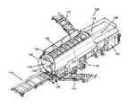 As shown inFIGS. 14 and 15, theangled sides131,149 of thedeflectors124,126 allow theconveyor110 to be positioned at an angle θ without interfering with thedeflectors124,126. That is, theangled sides131,149 of thedeflectors124,126 provide an angled gap between themselves and theconveyor110, and theconveyor110 can move through that angled gap without interfering with thedeflectors124,126.