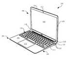 Lid portion108 can includedisplay116 and rear cover118 (shown more clearly inFIG. 3) that can add a cosmetic finish tolid portion108 and also provide structural support to atleast display116. In the described embodiment,lid portion108 can includedisplay trim120 that surroundsdisplay116. In some embodiments, bothdisplay116 and display trim120 can be overlaid by a transparent substrate along the lines of high strength glass or plastic.Lid portion108 can be moved with the aid of a number of hinges that pivotally couple the lid portion to the base portion, from the closed position to remain in the open position and back again.Display116 can display visual content such as a graphical user interface, still images such as photos as well as video media items such as movies.Display116 can display images using any appropriate technology such as a liquid crystal display (LCD), OLED, etc.Portable computing system100 can also includeimage capture device122 located ondisplay trim120.Image capture device122 can be configured to capture both still and video images.Display trim120 can be supported by structural components (not shown) withinlid portion108 but attached torear cover118.Display trim120 can enhance the overall appearance ofdisplay116 by hiding operational and structural components as well as focusing attention onto the active area ofdisplay116. In some embodiments, display trim120 can be colored to blend seamlessly in withdisplay116 whendisplay116 is not illuminated. In addition to display trim120,lid portion108 can also include achin cover124 that covers a region oflid portion108 belowdisplay116. Chin cover124 can be formed from a thin layer of plastic or glass and colored to blend pleasingly in with the rest ofportable computing system100. In some embodiments,chin cover124 can be configured to mask the appearance of data cables descending from a bottom edge ofdisplay116. Chin cover124 can also include markings to help identify a type or brand associated withportable computing system100.Top case104 can also definedata port126 andaudio port128, which can both be used to transfer data between an external circuit(s) andportable computing system100. In some embodiments,data port126 can be configured to receive power and transmit data.Lid portion108 can be formed to have unibody construction that can provide additional strength and resiliency tolid portion108 which is particularly important due to the stresses caused by repeated opening and closing. In addition to the increase in strength and resiliency, the unibody construction oflid portion108 can reduce overall part count by eliminating separate support features.Top case104 can also define an array of speaker holes130 through which speakers coupled tobottom case106 can transmit audio content.Top case104 can also definemicrophone openings132 that are configured to provide a conduit through which microphones withinbase portion102 can record audio content.
