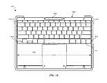 FIG. 31 illustrates an isometric view of an interior portion of device portable computing system withtouch pad112 showing thetouch pad112 having force sensors andactuator3136 for providing feedback, in accordance with the described embodiments. The location of the user's finger(s) or other external object(s) in the X-Y plane oftouch pad112 can be sensed using the touch sensor oftouch pad112. Downwards and upwards motion along the Z-axis can be detected using force sensors. As shown inFIG. 31,touch pad112 may have a touch pad member3124 (sometimes referred to as a track pad member). The touch sensor array can be used to measure the position of external objects such as finger3126 with respect to the X and Y lateral dimensions oftouch pad member3124. As indicated bydots3132, there may be more than one external object (i.e., more than one finger) touching touch pad member3124 (e.g., when a user is making a multi-touch gesture command). Arrangements in which a single object is touching touch pad member24 are sometimes described herein as an example. This is, however, merely illustrative. One object, two objects, three objects, or more than three objects may simultaneously contacttouch pad member3124 if desired.