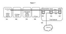 FIG. 7 shows a non-limiting example of a configuration of an inter-RAT hybrid network; in this case, the node device operates on the HSPA protocol and the cellular network operates on the LTE protocol with SGW, PGW, and ePDG gateways.