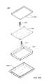 Hollow spacers213 may be placed belowdimples206 intop metal shell204, and rivets214 provided, extending through openings indimples206, throughhollow spacers213 and through openings in printedcircuit board210 tobase metal shell202 in order to fixedly secureelectronic assembly208 within the enclosure formed by base andtop metal shells202,204. A security mesh or tamper-respondent sensor216 is wrapped around the top, base, and four sides of the enclosure formed by base andtop metal shells202,204. As illustrated, in one or more embodiments,top metal shell204 may have an opening through which abus220 extends. One end ofbus220 may be connected to conductors (not shown) on printedcircuit board210, and the other end may be connected to conductors (not shown) on a printedcircuit board222. Asbus220 passes through the opening, the bus extends between aninner edge region223 of thesecurity mesh216 and an overlapping,outer edge region224 of thesecurity mesh216. A group ofwires226 connect, in one embodiment,security mesh216 to conductors on printedcircuit board210. Circuitry on printedcircuit board210 is responsive to a break or discontinuity insecurity sensor array216, in which case, an alarm signal may be emitted onbus220, and also encryption/decryption keys stored withinelectronic assembly208 may be erased.