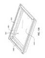 FIGS. 14A & 14B depict in greater detail one embodiment of anelectronic enclosure1400, similar toenclosure820 described above in connection withFIGS. 8A-13C. Referring collectively toFIGS. 14A & 14B, in this example,electronic enclosure1400 includes an innermain surface1401, which may be substantially flat, and aninner sidewall surface1402, which in this example joins to innermain surface1401 via a curved (or radiused)transition region1403 around the inner perimeter ofelectronic enclosure1400.Region1403 provides a gradual transition betweeninner sidewall surface1402 and innermain surface1401, which in one or more embodiments, may be oriented orthogonal to each other. In the configuration depicted,electronic enclosure1400 also includes multiple inner-sidewall corners1410, which may be configured to facilitate transition between adjoining sides ofelectronic enclosure1400. By way of example, in the enlarged depiction ofFIG. 14B, one inner-sidewall corner1410 is illustrated, which joins afirst side1404 and asecond side1405 ofelectronic enclosure1400. In one or more implementations, each inner-sidewall corner may be similarly configured. In the exemplary embodiment, which is presented by way of example only, inner-sidewall corner1410 includes a flat, angled-sidewall portion1411, and first and second curved-sidewall portions1412,1413 located at opposite sides of flat, angled-sidewall portion1411 as shown.