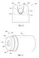 FIG. 12 shows an elevational view of an arcuate-shapedfront end1200 of a non-contact voltage measurement system. Thefront end1200 includes a recessedportion1202 defined by first and secondextended portions1204 and1206. The recessedportion1202 includes a relatively large upper arcuate-shapedportion1208 which receives aninsulated wire1210 having a relatively large diameter. The recessedportion1202 also includes a relatively small lower arcuate-shapedportion1212, below theportion1208, which receives aninsulated wire1214 having a relatively small diameter. Asensor assembly1216, which may be similar to thesensor assembly1000 shown inFIG. 10 and which is covered by theportions1208 and1212, may have a shape that substantially conforms to the arcuate-shapedportions1208 and1212 so that thesensor assembly1216 substantially surrounds wires having a relatively large diameter (e.g., wire1210) and wires having a relatively small diameter (e.g., wire1214).