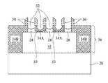 In the second etching step,hard masks24 and the vertical portions ofhard mask layer30 are in combination used as the etching mask for the second anisotropic etch, and hence the sidewalls ofsemiconductor strip base32 may be vertically aligned to the outer sidewalls of the vertical portions ofhard mask layer30. Depending on the etching process, there may be some undercuts formed, resulting in the exposed sidewalls ofsemiconductor strip base32 to be tilted and recessed from the respective outer edges of the vertical portions ofhard mask layer30.