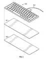 In addition to keys203 (extending out of an upper surface to provide selectable inputs based upon the characters associated with the keys, such as a QWERTY keyboard that provides ASCI binary code),keyboard202 may also includeelectromechanical layer301 having membranes, lever structures, metal plates, domes, and/or electronic circuits necessary for the operation ofkeyboard202 as an input device. In alternative embodiments,keyboard202 may include capacitive touch or other features that detect key presses with or without physical movement ofkeys203.