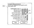 However, in order to ensure that a lower-level administrator does not add the ability to wipe highly sensitive data, such as encryptionkey data302, when the intention is to restrict that ability to only the highest of authorization levels, the available data categories that are configurable by each administrator/user level may be cascaded. Turning toFIG. 9a, an example of anadministrative interface700, such as a dialog box that may be displayed at theserver40 for configuring the various authorization-wipe rules for theIT policy361, is shown. Each level of administrator/user, with the exception of the highest level of authorization, is provided with access to modify only the wipe permissions for lower authorization levels; but the ability to modify the wipe permissions for those lower authorization levels is determined by the permissions granted to the authorization level currently logged into theserver40. InFIG. 9a, for example, an administrator ofauthorization level 3 is logged in; because only an administrator ofauthorization level 4 is provided authority by the server functions to alter theauthorization level 3 wipe permissions, the checkboxes for selecting data types wipable by administrators ofauthorization levels 3 and 4 are not alterable, as can be seen by the formatting of the headings “3” and “4” in theinterface700, and the dashed lines in the checkboxes under those headings. The administrator currently logged into the server in this example is able to make certain changes to the wipe permissions ofauthorization levels 0, 1, and 2, but only for those data types for which the administrator has permission to wipe; in other words, the currently logged-in administrator cannot grant wipe permissions that he or she does not currently have. In the example ofFIG. 9a, the currently logged-in administrator has permission to wipe message data, calendar data, address book data, user-created data, and third-party applications, but not PIM/messaging applications, encryption keys, or IT policies, and is therefore presented with a set of configuration options enabling the logged-in administrator to configure security operations such as wiping and/or encryption for users and administrators having a lower authorization level. Thus, the selection boxes for PIM/messaging applications, encryption keys, and IT policies are disabled (as illustrated inFIG. 9a, with dashed lines) for all levels of authorization.