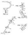 FIG. 7B is a representation of lung clamp end effectors111. The lung clamp end effectors extend from theshaft15 witharms112 which terminate inloops114 which defineopenings115. While not shown in detail inFIG. 7B, thearms112 are similar to the arms of the grasper ofFIG. 7A in that they are slightly rounded on their outer peripheries in the same profile as theshaft15, include first portions116 which are relatively straight in their at rest open position andmiddle portions118 which angle away from each other until they extend approximately 6 mm apart from each other. Theloops114 are then bent back to parallel the first portions116. In order to provide a good spring load, the middle portions of the arms may be reinforced with or formed from spring steel.