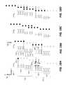 Further embodiments of printheads and printing systems will be described below, but it is instructive to consider methods of printing using the printhead configuration embodiments described above.FIGS. 11A through 11E schematically show snapshots at successive times during a first print stroke. A stroke is defined as a plurality of print cycles during which dropejectors212 in the two-dimensional array150 (FIG. 6) are fired, such that during one stroke alldrop ejectors212 in the two-dimensional array150 (FIG. 6) are fired once.FIGS. 11A to 11C show snapshots at three times t1, t2and t4asdrop ejectors111 to114 fromgroups121 and123 in a single column eject drops of ink while the recording medium62 (FIG. 6) is moved relative to printhead die215 alongscan direction56. Note: relative motion of therecording medium62 and the printhead alongscan direction56 is sometimes referred to herein as moving relative to the printhead, or to the printhead die, or to the drop ejectors. All of these expressions are understood to be equivalent herein. The relative motion during drop ejection can consist of transporting the recording medium past the stationary printhead or transporting the printhead past the stationary recording medium. For simplicity, the recording medium62 (FIG. 6) is not shown inFIG. 11 but just the dot locations. Numbering of drop ejectors, groups and banks is similar to that used inFIGS. 7 and 8.Allowable pixel locations300 are shown as unfilled circles, while already enabled print dots are shown as filled circles. InFIG. 11A at an initial time t1,endmost drop ejector111 fromgroup121 inbank131 and correspondingendmost drop ejector111 fromgroup123 inbank132 are simultaneously enabled to fire during a first printing cycle to formfirst dots301 atfirst positions311 on the recording medium that are aligned withdrop ejectors111 at time t1. Whether or not drops of ink will actually be ejected bydrop ejectors111 to formfirst dots301 is controlled according to image data from image data source2 (FIG. 6).