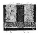 Example 8: Physical and Electronic CharacterizationSamples were characterized using an optical microscope (Leitz) and a field-emission scanning electron microscope (FESEM) operating at 5 kV. Sample features were encased in a silver-containing, conductive epoxy to limit charging effects during characterization. A diamond band saw running at 250 rpm and an ion cross-polishing system (JEOL) running at 5.5 kV, were used to cut and polish cross-sectional samples of the constructed features. Singular profilometry scans were conducted with aDektak 150 profilometer with a lateral resolution of 0.050 μm per sample. Three-dimensional models and volumetric data were processed with Veeco “Vision” software.