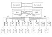 FIGS. 3A through 3D show various block diagrams exemplifying the connecting arrangement between the host(s) and redundant SVC, the host-side IOdevice interconnect controller220, and the CPC according to the present invention. In a first embodiment shown inFIG. 3A, ahost10 is connected through separate ports with two host-side IOdevice interconnect controllers220, both connecting to thesame CPC240. In a second embodiment shown inFIG. 3B, twoseparate hosts10 and12 are each connected to a separate host-side IOdevice interconnect controllers220, both connecting to thesame CPC240. In a third embodiment shown inFIG. 3C, ahost10 is connected to a host-side IOdevice interconnect controllers220 and then to theCPC240, while asecond SVC800 is connected to aRCC interconnect controller236 and then to thesame CPC240. In a fourth embodiment shown inFIG. 3D, a fibre-to-SAS SVS architecture is disclosed. Twoseparate hosts10 and12 and aSVC800 are each connected to afibre switch120, and a host-side IOdevice interconnect controller220 and aRCC interconnect controller236 are connected to thefibre switch120. The host-side IOdevice interconnect controller220 and theRCC interconnect controller236 are connected to thesame CPC240. The switch can be implemented with a multiplexer. When the host-side IOdevice interconnect controller220 is implemented to have a SAS port therein for connecting with the host port of the host entity, it is similar to the SAS port provided in the device-side IOdevice interconnect controller300, but configured in target mode rather than in initiator mode.