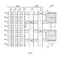 With a small spacing (gc=2f), the contact vias (e.g.13a,13c,13e) are dense contact vias. They fence the substrate circuit0K in such a way that the interconnect of the substrate circuit0K cannot pass through thegaps04gbetween the contact vias13a,13c . . .(FIG. 1D). This severely limits the design flexibility of the substrate circuit0K. Because the dense contact vias completely separate the first andsecond decoders14,24, thesecond decoder24 cannot share any components with thefirst decoder14 and needs to be a full decoder (FIG. 1E). This requires the x-line21aon thememory level20 to extend an excessive distance Lpxto reach the contact vias23a(FIG. 1A). Long Lpxlowers the array efficiency and reduces the memory density. More details will be disclosed in the following paragraphs.
