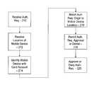 The financial transaction method further includes identifying, in the managingcomputer system110, at least onemobile device160 associated with the payment card account against which a request for authorization has been received by accessing data stored in the memory device (Step214). The financial transaction method further includes inStep216 determining in the managingcomputer system110 whether the geographic origin of the authorization request matches the geographic location determined by themobile device160. InStep218, the financial transaction method includes either permitting both the payment card transaction to be processed for authorization when the geographic origin of the authorization request matches the geographic location determined by the mobile device or taking action to permit denying the authorization request for the transaction to be processed for authorization when the geographic origin of the request does not match the geographic location of the mobile device. InStep220, the payment card authorization request is either approved or denied, and the appropriate message is sent to themerchant140.