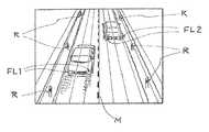 DETAILED DESCRIPTION OF THE PREFERRED EMBODIMENTSFIG. 1 shows the complete situation which could be captured by the front camera (1) of a vehicle (5) if there is sufficient light. The camera image shows a road with a dashed median (M), an oncoming vehicle with headlights (FL1) on the left side and a vehicle moving in front with tail lights (FL2) on the right side and reflectors (R) arranged to the left and right on the roadside.