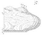 Optionally, a textured, embossed, or debossed surface pattern can be applied to theflooring face layer30 of the fused base and face layers. Such a texture can be an imitative decorative texture complementing a printeddecorative pattern33, or can be a texture intended to improve traction, light reflection, or other qualities of the finished flooring. The textured, embossed, or debossed surface pattern can be applied to theflooring face layer30 of the fused base and face layers either concurrently with the hot-melt overlaying compression stage or immediately after, while theflooring face layer30 is still partially melted and pliable. The hot-melt roller or rollers making contact with theflooring face layer30 can be configured to emboss the texture, although the arrangement would require either a small repetitive period of the texture or a large roller. The embossing can be performed by one or more rollers, plates, or other devices, such as rakes pressing into theflooring face layer30 of the now-fused base and face layers immediately after the hot-melt overlaying compression, while the partial assembly is still pliable. Depending on the amount and nature of the texturing, cylinders of stiff wire could be used as rollers for debossing, perforated cylinders could be used as rollers for embossing, or a rake arrangement, possibly allowing for movement of the tines in order to create variation, could be used.