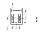 FIG. 24 illustrates an exemplary embodiment of abattery2412 coupled to a receiver, wherereceiver2402 may be used for receiving wireless power transmission from a transmitter. In some implementations, thereceiver2402 may include one ormore antenna elements2404. The number, spacing and type ofantenna elements2404 may be calculated according to the design, size and/or type of external battery. Thereceiver2402 also includes other components such as arectifier2406, an electriccurrent converter2408, and acommunications component2410 including a communication circuit associated with a communication antenna.