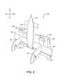 FIG. 2 is a simplified illustration of a UAV, according to an example embodiment. In particular,FIG. 2 shows an example of a tail-sitter UAV200. In the illustrated example, the tail-sitter UAV200 has fixedwings202 to provide lift and allow the UAV to glide horizontally (e.g., along the x-axis, in a position that is approximately perpendicular to the position shown inFIG. 2). However, the fixedwings202 also allow the tail-sitter UAV200 take off and land vertically on its own.