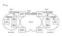 As shown inFIG. 1B, assume thathost server1 indata center1 needs to provide a packet to hostserver2 indata center1, and thathost server1 provides the packet to NVE1.NVE1 may perform a lookup for an address (e.g., a media access control (MAC) address) associated withhost server2, and may determine a VNI (e.g., VNI-1) and an endpoint address (e.g., an address associated with NVE3) for a packet header based on the lookup. NVE1 may provide the packet encapsulated with the header tonetwork device1, as further shown inFIG. 1B.Network device1 may translate the VNI of the packet header from VNI-1 to a global or common VNI (e.g., VNI-100), and may forward the packet tonetwork device3.Network device3 may translate the VNI of the packet header from VNI-100 to VNI-2 so that the packet may be forwarded in the second data center. As further shown inFIG. 1B,network device3 may forward the packet toNVE3, andNVE3 may forward the packet to hostserver2.