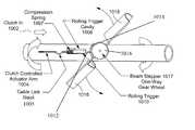 FIGS. 10 and 11A show a portion of aturbine shaft assembly1000 with another embodiment of a flywheel.FIGS. 10 and 11A includearrow1002,clutch control arm1004,cable link1006,compression spring1007, rollers1008a-c,trigger cavity1010, rollingtrigger1012,pin1014, teeth1015,disc1016,gear1018, andflywheel1018. In other embodiments, the portion ofturbine shaft assembly1000 ofFIGS. 10 and 11A may not have all of the components listed above or may have other components instead of and/or in addition to those listed above.