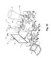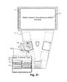 Referring still toFIGS. 1 through 3,table assembly12 includes aleg support structure15, a tabletop member orassembly24,large display screen18a(See alsoFIG. 6) and a power/control assembly32.Leg structure15 supports thetabletop assembly24 so that a topflat surface26 thereof is substantially horizontal.Tabletop member24 has a polygonal shape with afront edge21 and an opposite and parallelrear edge23 and first and second lateral side edges25 and27, respectively, where the side edges traverse the distance between ends of the front and rear edges.Rear edge23 is longer thanfront edge21 so that the side edges25 and27 angle toward each other when moving from the rear edge toward the front edge and the side edges are symmetrical and straight so that if thetabletop member24 were divided down the middle from front to rear edges, the two sides would mirror each other.