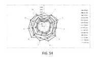 FIGS. 53 and 54 show how a distance between the sensor bar and a detected object is derived from the strength of the detector signal. Reference is made toFIG. 53, which is a simplified illustration showing a proximity sensor scanning an object at four different distances from the object, in accordance with an embodiment of the present invention.FIG. 53 showssensor bar510scanning object821 at four locations620-623, each a different distance fromobject821. The magnitude of the detected reflections ofobject821 is weaker as the distance increases. Reference is made toFIG. 54, which is a radar plot of detection signals generated by scan sequences performed at multiple locations around an object, and at different distances from the object, in accordance with an embodiment of the present invention.FIG. 54 shows a radar plot of detection signals generated by the proximity sensor bar at 14 different locations, 40 mm-105 mm from the object with a 5 mm step between locations.FIG. 54 shows that radar plots for detections generated atlocations 20 mm apart do not intersect. Thus, detection signal strength is used to detect a distance between the object and the sensor bar at a resolution of 20 mm.