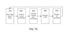 Reference is made toFIG. 71, which is a simplified flow chart of a process for converting scan information into a 3D representation of a scanned object, in accordance with an embodiment of the present invention. The process ofFIG. 71 combines multiple 2D scan information into a 3D model of the object. Atstep1011 all scan information from all scans made is analyzed to identify object edges in the scan information; determine the size of the object; determine an initial launching point of the object in the 3D domain, based on the object's size; and, in each scan, identify the active emitter-detector pairs that detected the object. This last parameter is used to determine if the proximity sensor bar was shifted during scanning. Atstep1012 the detection signals are converted into 2D coordinates. At step1013 a slice of the object is created by combining 2D scans taken by the proximity sensor from four sides of the object at a common height. This slice is also called a “frame”. At this stage the system connects the edges identified in the different 2D scans to form a closed shape, and also calculates the center of gravity of that shape.