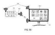 Reference is made toFIG. 90, which is an illustration of a wireless input-output system, in accordance with an embodiment of the present invention.FIG. 90 showssmartphone833 displayingGUI901. The GUI is transmitted over a firstwireless communication channel630, e.g., using the Wi-Fi Direct standard used by Miracast-certified devices, toTV832. Thus, anenlarged GUI902 onTV832 includes the same elements asGUI901.
