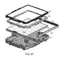 Reference is made toFIG. 87, which is an exploded view of a touch screen assembly featuring two proximity sensor bars510 and511 along adjacent edges of the screen, in accordance with an embodiment of the present invention.FIG. 87 showstop cover830 andbottom cover831,display screen816,proximity senor bars510 and511 andlight guide309.Light guide309 directs light beams fromproximity senor bars510 and511 over and across the exposed upper surface ofdisplay screen816 and similarly directs reflections of those beams by objects touching the display screen back ontoproximity senor bars510 and511. In some embodiments, one shared processor synchronizes activations of the emitters and detectors of bothproximity senor bars510 and511.