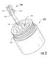 As illustrated, thebase202 may define areceptacle228 configured to receive thecontrol component terminal204 therein. In this regard, as illustrated inFIG. 4, thecontrol component terminal204 may couple to thebase202. For example, thecontrol component terminal204 may be retained in thereceptacle228 of thebase202 via interference fit, for example due to contact between theprotrusions224a,224band the base. As described below, thecontrol component terminal204 may extend through the base202 to a position at which it may form an electrical connection with a control body to which thecartridge200 connects. Further, thebase202 may define threads orprotrusions230 configured to engage theexternal shell212, as will be described below.