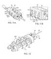 FIGS. 11A and 11B illustrate perspective views of thehousing90 where each of the needles is partially deployed. The curved or arcuate needles are shown as having been at least partially rotated from their delivery configuration to their deployed configuration. The needle piercing tips are also shown with astylet clearance slot110 defined along each needle body proximal to the piercing tip. Thestylet clearance slot110 provides for passage of thestylet89 in proximity to the deployed needles when thestylet89 is used to pass the suture through the suture loops passed by each needle through the tissue, as described in further detail below.